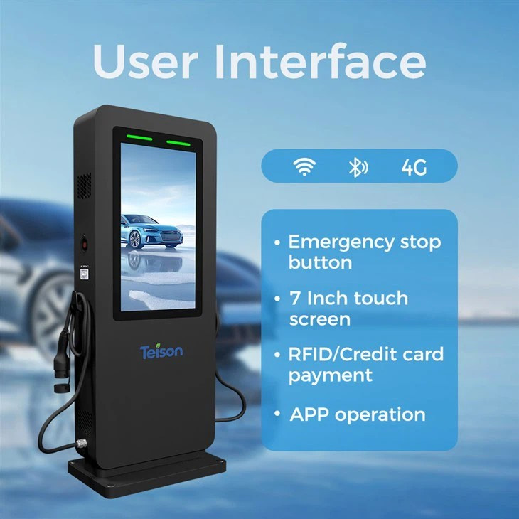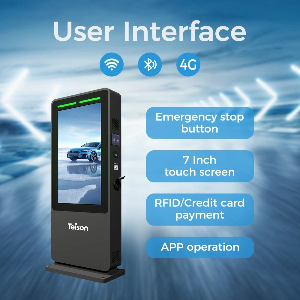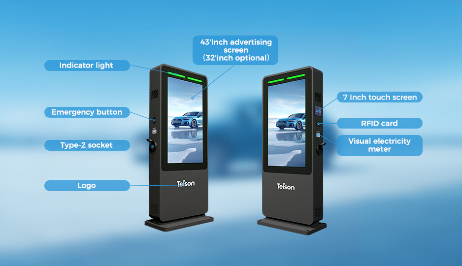 เครื่องชาร์จแบตเตอรี่รถยนต์ไฟฟ้าแบบตั้งพื้นมีจอแสดงผลขนาดใหญ่ 32" EV Charger Teison Pro Smart Twin 2x11kW และ 2x22kW Type 2
