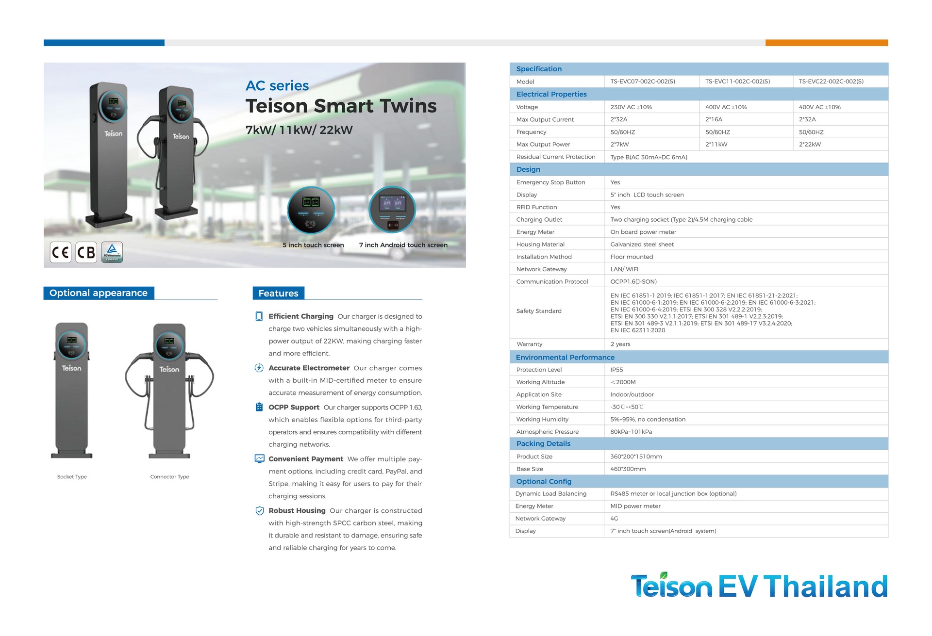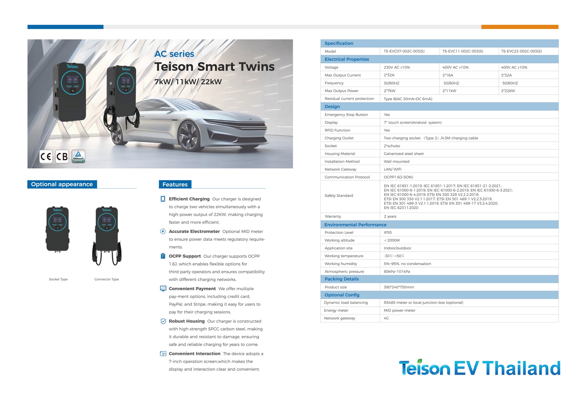 เครื่องชาร์จแบตเตอรี่รถยนต์ไฟฟ้าแบบแขวน EV Charger Teison Pro Smart Twin 2x11kW และ 2x22kW Type 2