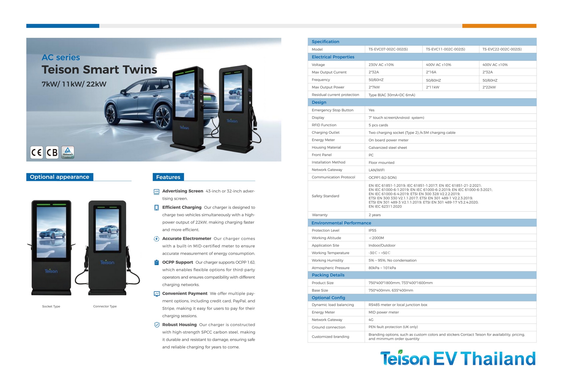 เครื่องชาร์จแบตเตอรี่รถยนต์ไฟฟ้าแบบตั้งพื้น EV Charger Teison Pro Smart Twin 2x11kW และ 2x22kW Type 2